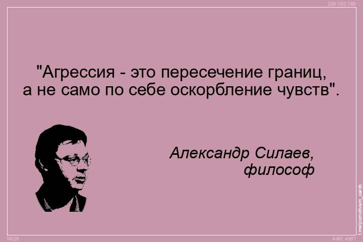 "text": "\"Агрессия - это пересечение границ,\nа не само по себе оскорбление чувств\".",