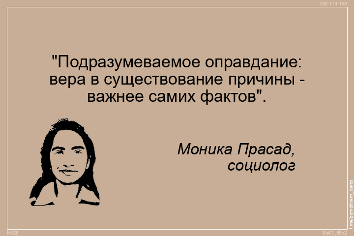 "text": "\"Подразумеваемое оправдание:\nвера в существование причины -\nважнее самих фактов\".",