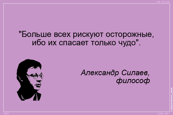 "text": "\"Больше всех рискуют осторожные,\nибо их спасает только чудо\".",